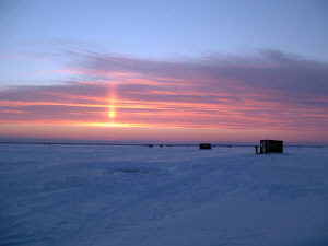 This was music to these drunken men's ears -- after singing La Bamba, completely lacking the correct lyrics but bringing the crowd of other fisher-people to their feet, the group went on to play songs including a re-worked version of "The Wreck of the Edmond Fitzgerald" including lyrics mentioning Baudette, Bombardiers, and the Borderview Lodge, Margaritaville (for a $5 tip) and other songs. Soon, they had worked their way into the anniversary party room, where much to their surprise, it turned out that the man who had been their fishing guide was the very same man celebrating his anniversary. As the band finished for the night and began to exit, the bartender asked one of the members of the band what their name was? Chuck Kolars (the man who would later be referred to as "the Pete Best" of the IceHoles) answered in his inimitable way: "Oh....Brian Ruhl....that's Brian Ruhl and The IceHoles"....and they all left. The current members include Matt Tews, Roy (The Dr.) Nelson, John Crane (the guy who found the Borderview Lodge to begin with) and Brian Ruhl. And "the legend lives on from the Borderview on down..." |